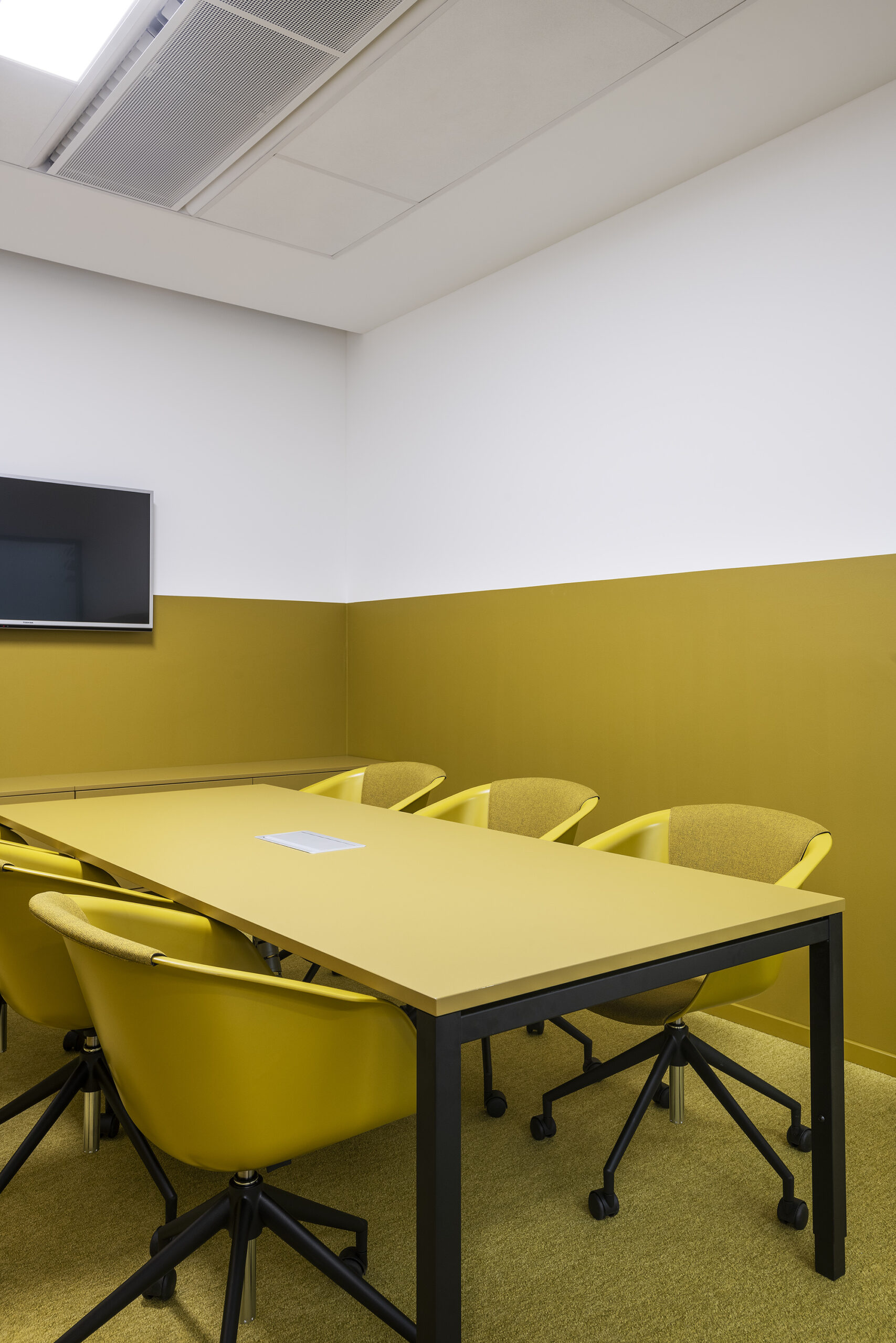 A tárgyalók az iroda kölünösen izgalmas pontjai voltak. A központi nagy tárgyalóba Motion Meet:me tárgyalóasztal került világos fa színben. Az asztalokat a munkaszékekhez passzoló Quarterback és Black Dot tárgyalószékek veszik körül. A kisebb tárgyalóba és a break-out terekbe pedig Op spot csillaglábas tárgyaslószékek kerültek részben kárpitozott kiadásban a már említett sárga vonulattal harmóniában.