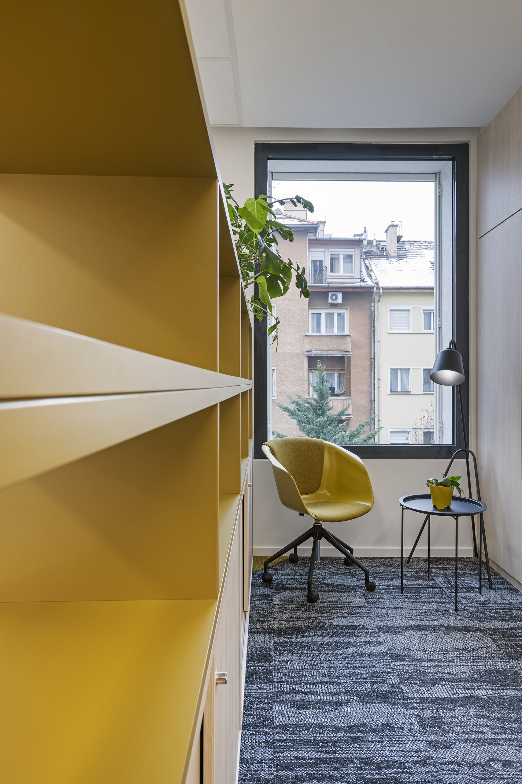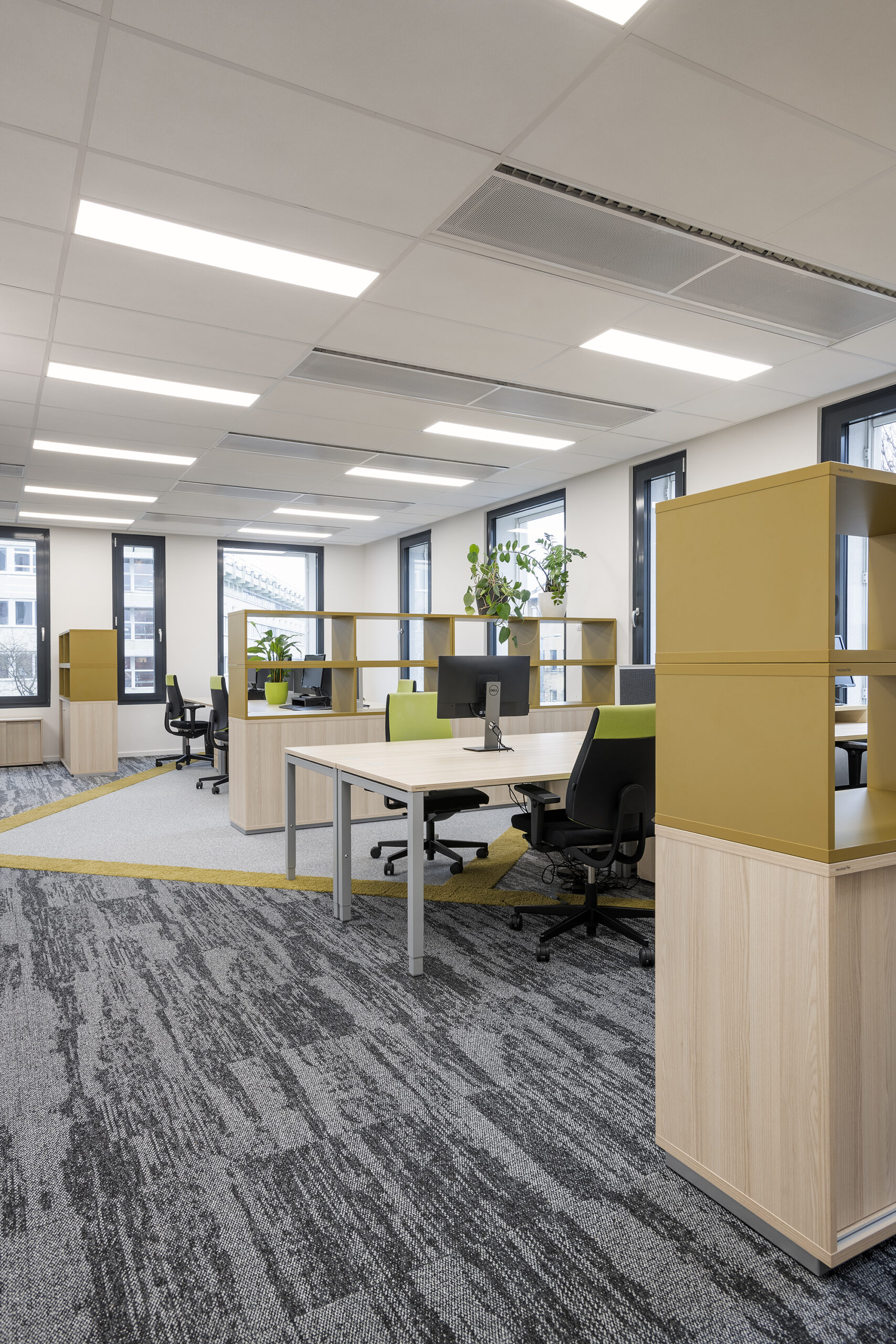 A bútorok kiválasztásánál fontos volt a hosszú távú használhatóság és a magas minőség. A munkahelyek számára Neudoerfler Motion asztalok és konkonténerek kerültek be. A munkahelyek akusztikai és vizuális elkülönítésére szintén Motion alukeretes paravánok szolgáltak. Az irodai tárolást és több helyen a finom térelválasztást Motion nyitott szekrények és tolóajtós szekrények segítették az új irodára jellemző visszafogott világos fa vagy meglepő sárga színben. A munkaszékek egy szintén sok évtizedes partnerünk, a Sedus gyárából kerültek ki: a méltán népszerű Quarterback irodaszékekre és a Black Dot görgős székekre irodaszesett a választás.
