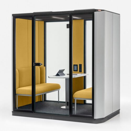 Az MDD Coda épített tárgyaló egy funkcionális megoldás irodák és közösségi terek számára. Négy fős térsaságok számára kínál kényelmes és csöndes privát találkozó és munkateret. A Coda telefonfülke minden előnyét magáénak tudja, sőt! Állítható szellőzés és fények, halk ventilátorok, foglaltságjelző fények, akusztikus üveg ablakok, hangelnyelő szövetek mellett beépített asztal és ülések teremtenek háborítatlan kollaborációs vagy munkateret. Nézze meg a Coda akusztikus fülkét is!