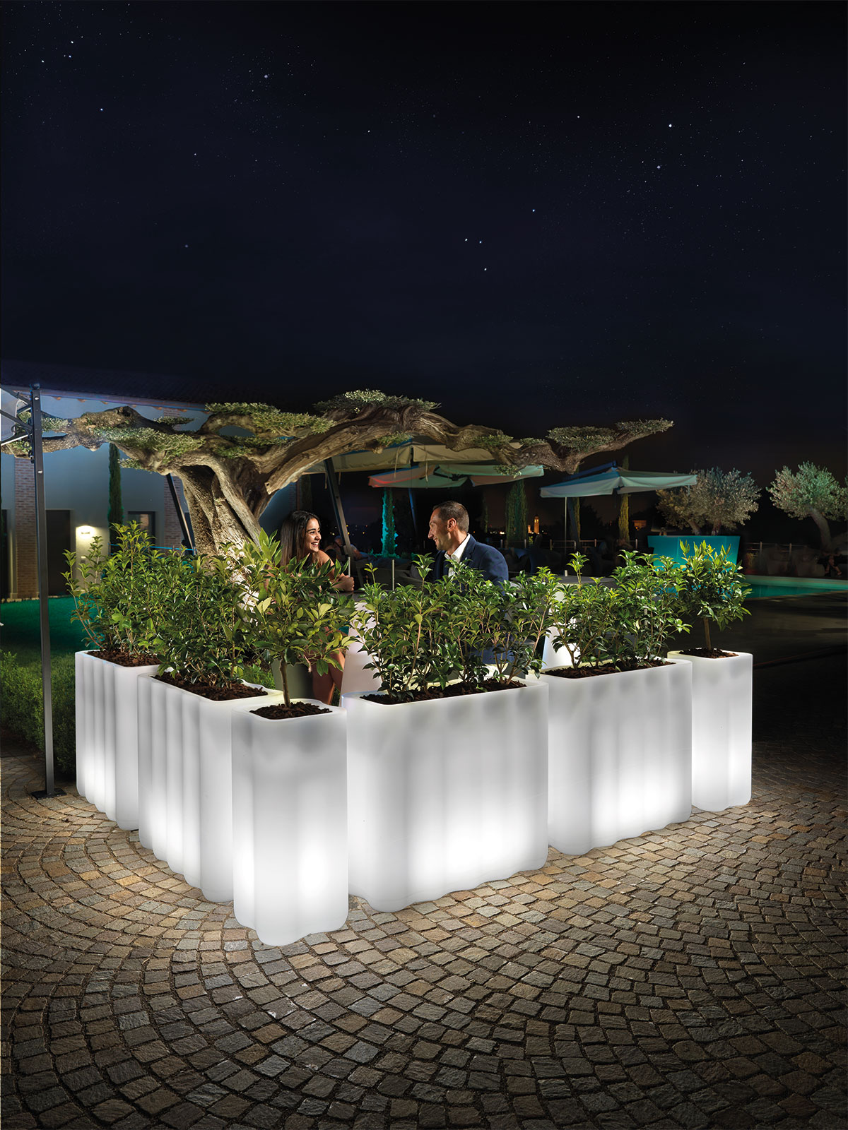 A Lyxo Nebula virágtartó különleges hullámos formája tökéletes útvonalak határolására vagy térelhatárolásra. Játékos vonalvezetése dinamikus határt képez. Felhő szerű megjelenése a beépített világítással rendelkező opcióban tündököl leginkább.